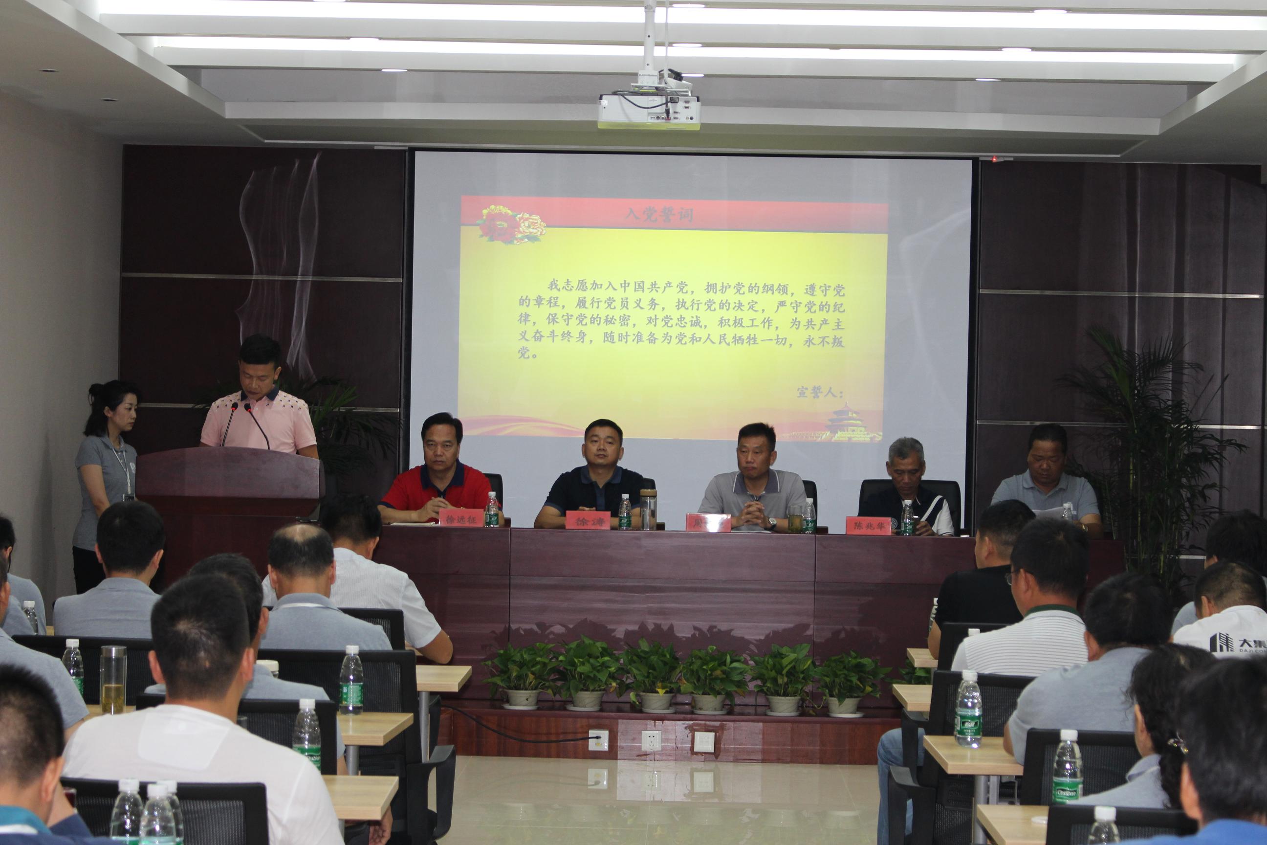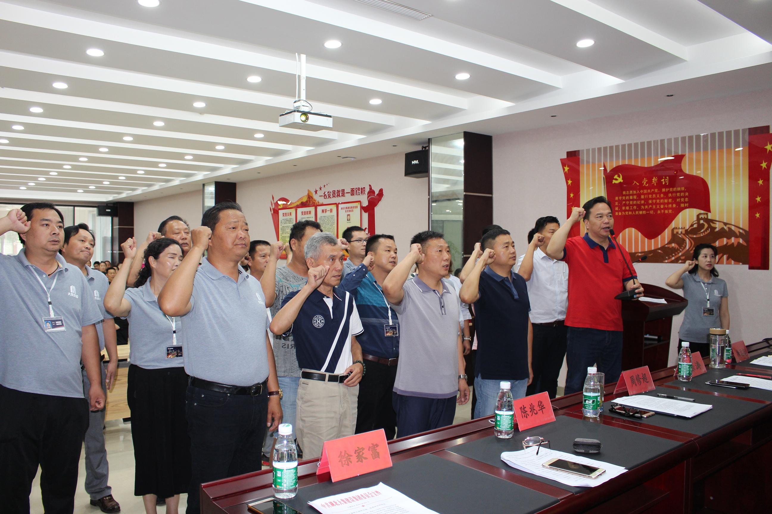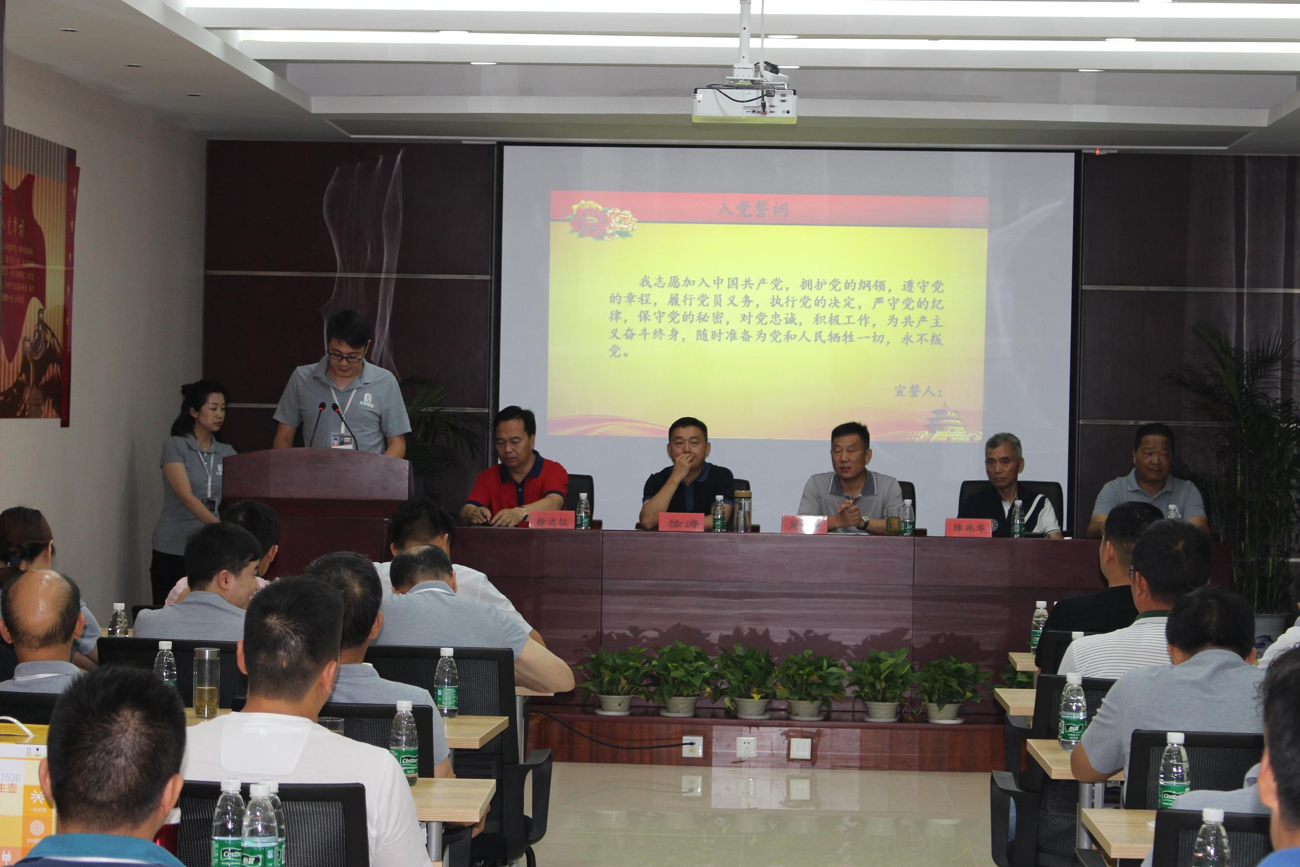 在慷慨激昂的大合唱《沒有共產(chǎn)黨就沒有新中國》中,會議拉開了序幕,熱血沸騰的歌聲結(jié)束后,由集團黨委副書記徐遠(yuǎn)征同志帶領(lǐng)新黨員做入黨宣誓,老黨員重溫入黨誓詞。