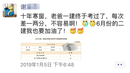 成功會遲到卻不曾缺席,2017年,謝守衛(wèi)通過經(jīng)濟(jì)與法規(guī)科目,2018年,通過管理與實務(wù)科目。十年磨“一建”,謝守衛(wèi)用他的堅持與努力向我們詮釋了一句話:想要學(xué)有所成,有所收獲,就必須要努力地去堅持!